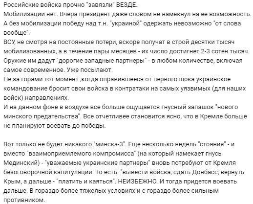 Нынешняя «мобилизация» прямо противоречит стратегическим интересам Донбасса, поскольку предполагает его жертвование ради интересов Москвы. А режиму в Москве все равно конец, рассчитывать на его помощь наивно, повторюсь, надеяться можно только на себя.