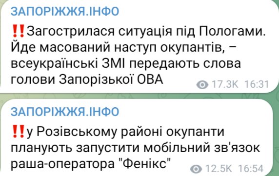 Украинские источники пишут о наступлении в районе Пологи. Но они вроде бы и так заняты ВС РФ, так что получается непонятно.