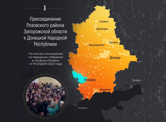 Но время не ждет, поэтому нашли паллиативный выход, присоединяя соседние районы к Днр. Сегодня объявили об этом для Розовского района, оформив «собранием уполномоченных представителей». Юридически это ни о чем, как и подобная акция в Мариуполе, но для галочки сойдет.