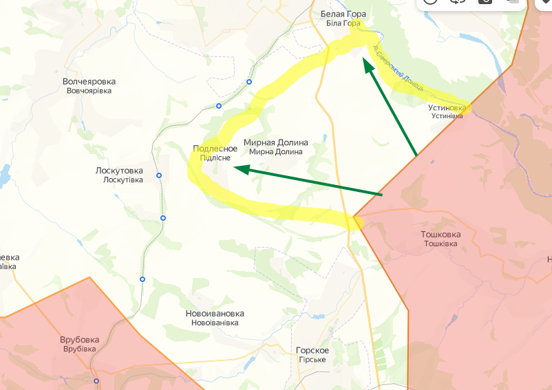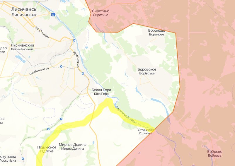 Лнр сегодня как-то резко умудрились захватить сразу несколько важных населенных пунктов: Устиновка, Подлесное, Мирная Долина и подошли к Белой Горе, южному пригороду Лисичанска. Тем самым автодорога Горское — Лисичанск перерезана и выйти из района Горское — Золотое можно только грунтовыми дорогами, но и те по большей части простреливаются.