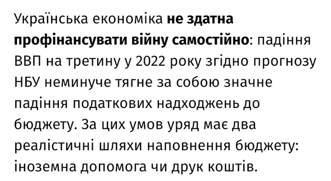 Это то, о чем я писал ранее. Наличие богатых союзников хорошо, но собственная экономика почти убита войной. А война когда-то кончится, и финансирование прекратится. Надежды, что Запад поделится отжатым у России добром, как по мне, наивны. Прежде всего, Запад свои расходы компенсирует, потом подумает о прибылях себе любимому, а Украина будет в конце списка.