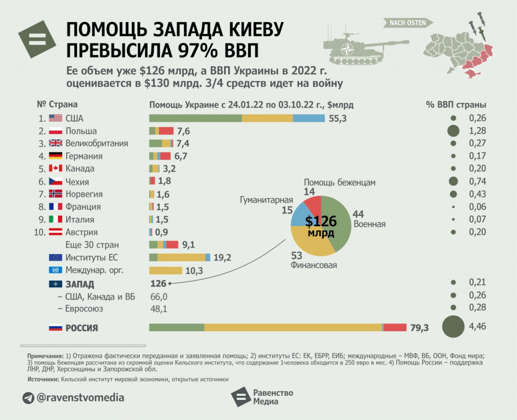 Около 75% помощи – поставки вооружения или финансирование военных расходов Киева. Больше всего средств выделили США ($55 млрд) и Евросоюз ($48 млрд), или по 0,3% ВВП. Самые активные друзья киевского режима – Эстония, помощь которой достигает 1,51% собственного ВВП, а также Латвия (1,29%), Польша (1,28%), Литва (0,83%) и Чехия (0,74%). https://t.me/ravenstvomedia/97