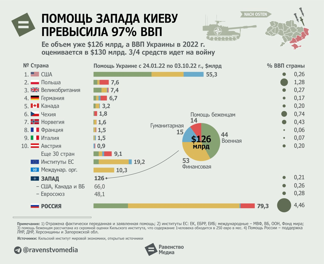 Обязательства западных стран перед Украиной – уже оказанная и обещанная финансовая, военная и гуманитарная помощь – к началу октября составили $126 млрд, подсчитало «Равенство» по последним данным (https://www.ifw-kiel.de/topics/war-against-ukraine/ukraine-support-tracker/) Кильского института мировой экономики. Это 97% ВВП страны за 2022 г., который оценивается (https://www.imf.org/en/Countries/UKR) МВФ на уровне $130 млрд.