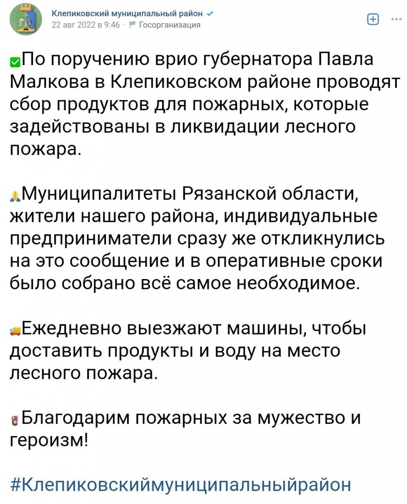 Губернатор Рязанской области Павел Малков оказался неспособен самостоятельно накормить и напоить пожарных, которые занимаются тушением пожаров в его области. Он в срочном порядке начал сбор еды и воды с населения. Судя по фото, рязанцы поделились с пожарными из столицы печеньками, консервами с селёдкой и развесной гречкой.