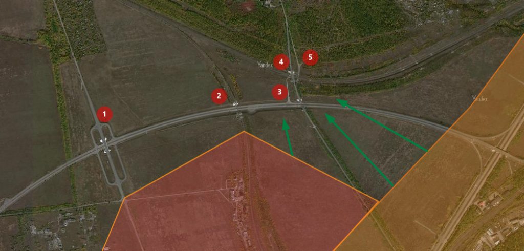 Все эти циферки — мосты, на которых очень удобно устраивать укрепы. Кроме 5, это руины «Царской Охоты. Как по мне, то Днров больше всего интересуют 3,4,5, там сразу посадка и за ней за частный сектор Авдеевки можно зацепиться.