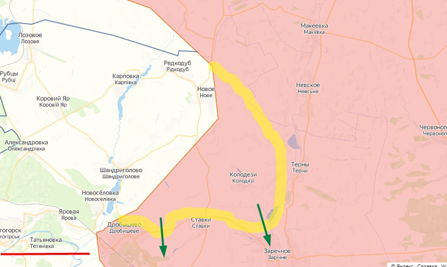 На участке севернее Кр. Лимана: Из района Колодязей Ук выходит к окраинам Заречного, а Торское, с перекрестком дорог, практически рядом. Уже ночью пришло сообщение о прорыве обороны между Дробышево и Ставками, а это значит, что батальоны в самом Дробышево попадают в окружение, чего, кстати, их командиры и опасались.