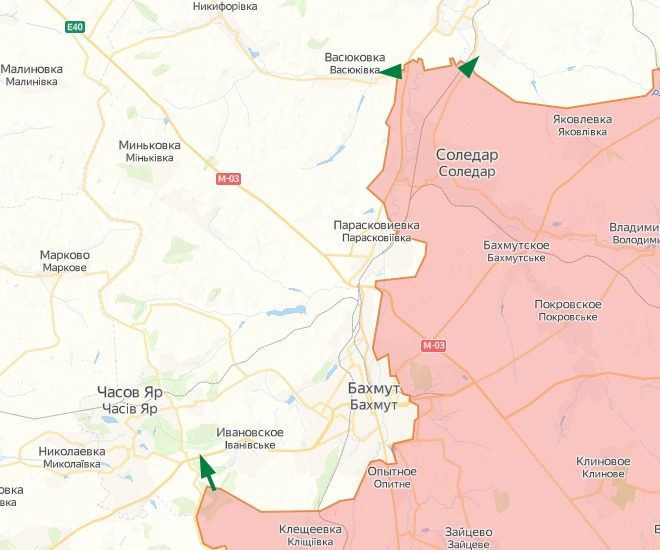 Продолжается охват города с одновременным продвижением по застройке с северо-востока. Сегодня прошло сообщение о физическом выходе на трассу Артемовск — Константиновка, вероятно у села Ивановское/Красное.