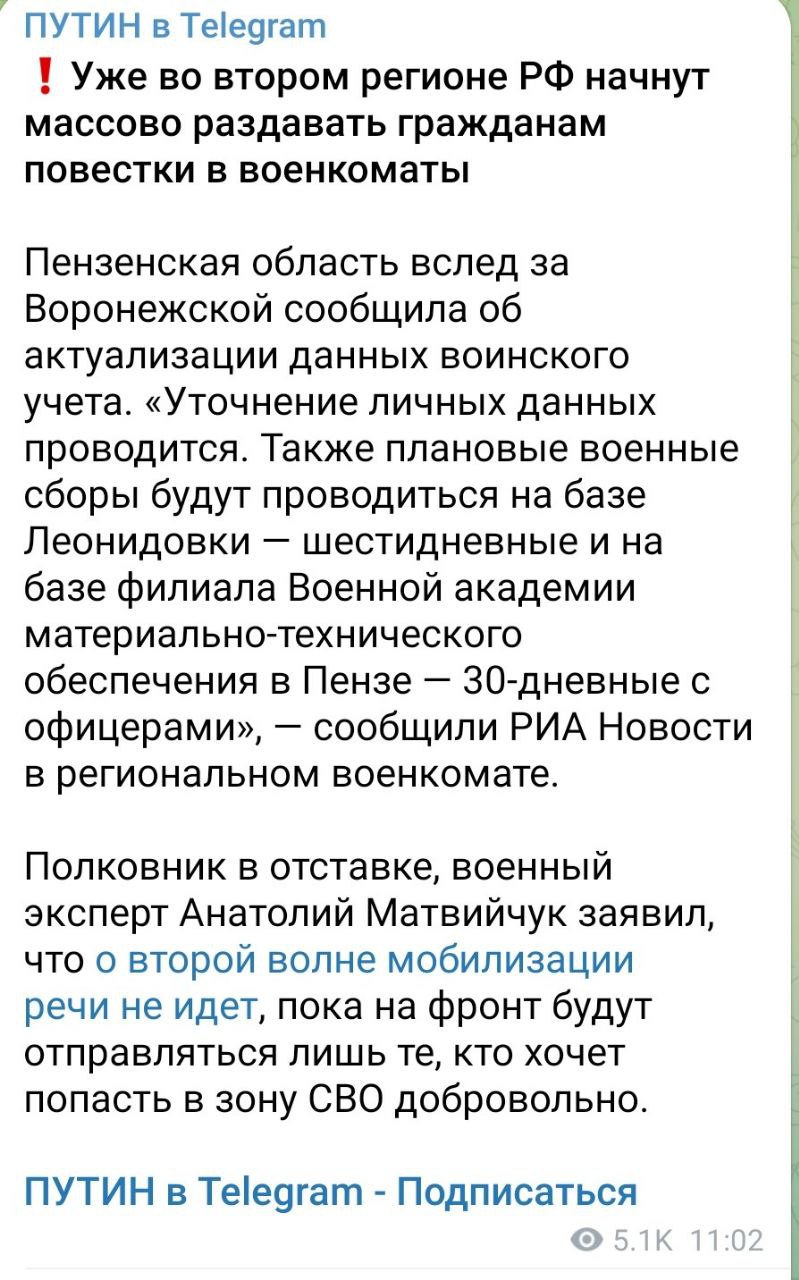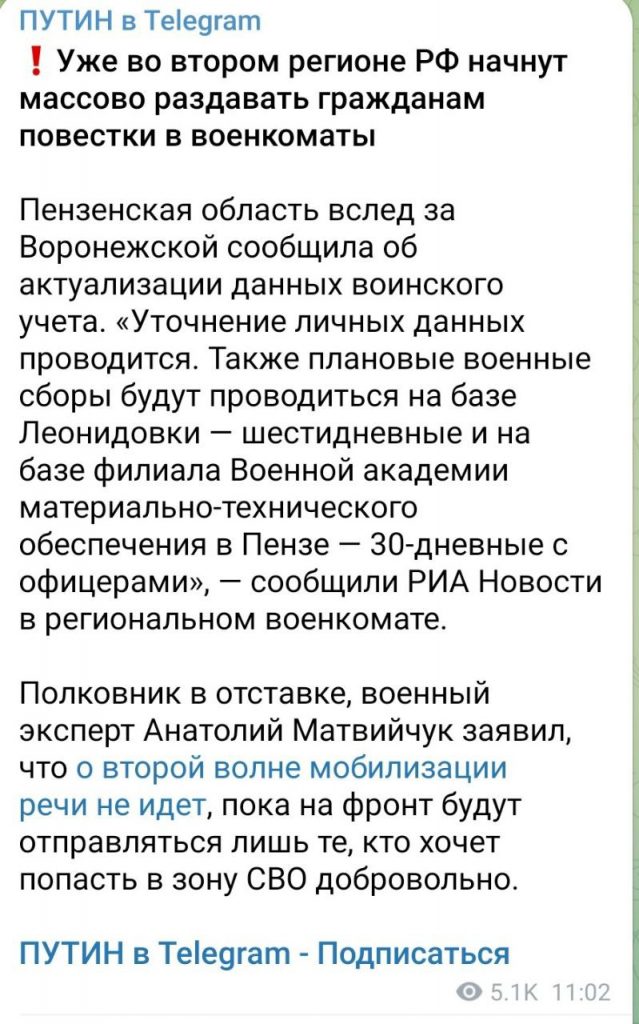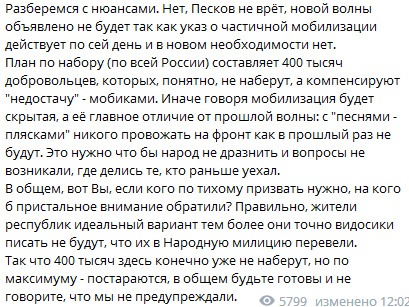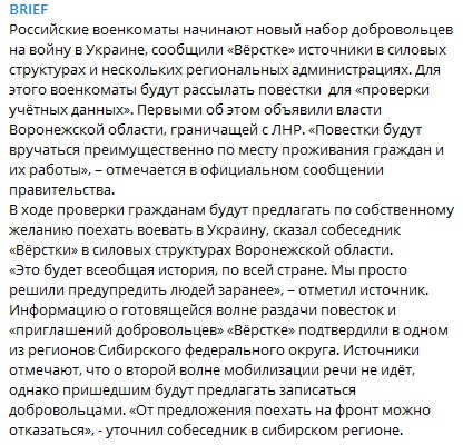 Безотносительно достоверности скринов полагаю такой вариант довольно реалистичным. Дело в том, что «цифровизация могилизации» (т е свод баз данных о мобрезерве в одну кучу, доступную военкоматам), запущенная в России, хотя и движется, но еще не настолько развернута, чтобы обеспечить необходимые объемы пополнений «без шума и пыли», т е массовых облав в городах России, крайне негативно действующими на общественные настроения.