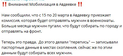 Еще прошла новость о будущей облаве-мобилизации мужиков в Авдеевке. Сама по себе идея устраивать могилизацию практически на линии фронта довольно странная. По опыту Донбасса (подконтрольной Рф части) могилизаторы на прифронтовые окраины лезут крайне неохотно, оттуда можно и не вернуться.