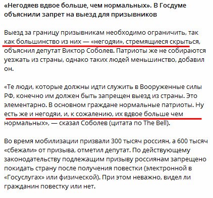 «Те люди, которые должны идти служить в Вооруженные силы РФ, конечно им должен быть запрещен выезд из страны. Это элементарно. В основном граждане нормальные патриоты. Ну есть же и негодяи, и, к сожалению, их вдвое больше чем нормальных», — сказал Соболев (цитата по The Bell).