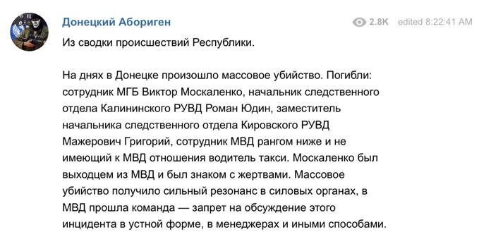 Примечательный факт: статистику отстрелянных полицаев все эти годы тщательно скрывали, даже междуусобные перестрелки карателей с двумя и более жертвами, о которых ходили слухи по всему Донбассу, все записывали в потери на фронте. Даже когда, до 22 г, на фронтах было относительное затишье.