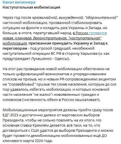 С ходом времени всевозможные слухи на тему мобилизации приобретают конкретику. Ранее отмечал, пока наиболее вероятны два варианта со стороны Москвы: попытка заморозить «как есть» или попытаться провести свое наступление.