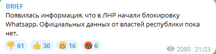 18.09.23 ряд новостных СМИ и ТГК сообщили о начале блокировки Whatsapp в ЛНР, отметив при этом отсутствие официальных комментариев.