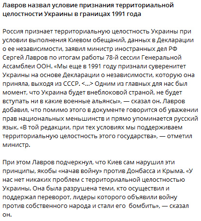 Россия признает территориальную целостность Украины при условии выполнения Киевом обещаний, данных в Декларации о ее независимости, заявил министр иностранных дел РФ Сергей Лавров по итогам работы 78-й сессии Генеральной Ассамблеи ООН.