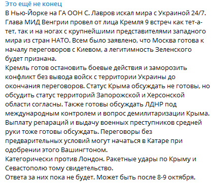Чуть позже информация о предложениях Лаврова, правда, в приглаженном виде, с некими оговорками, стала распространяться в ТГК.