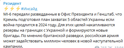 О тезисах Лаврова я уже писал ранее, а сегодня кучно пошли страшилки из серии «держите меня, я психический». ТГК «Резидент», известный как рупор Москвы, опубликовал сообщение о планах России собрать миллионную группировку в 2024 г и отнять 5 областей.