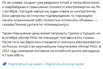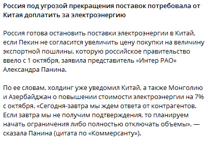 Россия готова остановить поставки электроэнергии в Китай, если Пекин не согласится увеличить цену покупки на величину экспортной пошлины, которую российское правительство ввело с 1 октября, заявила представитель «Интер РАО» Александра Панина.
