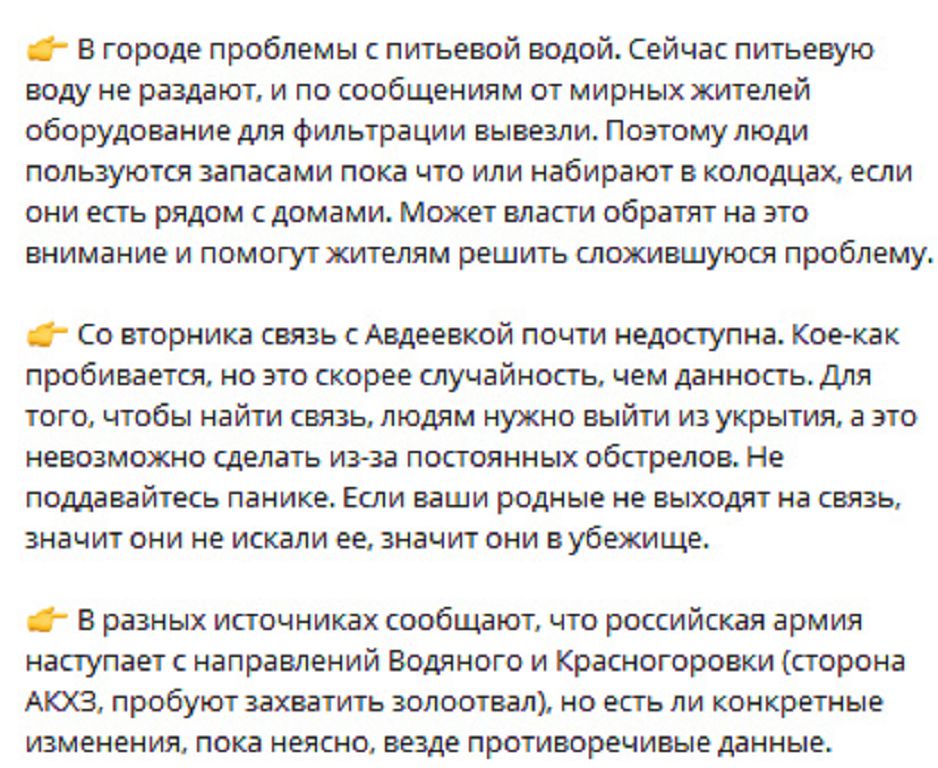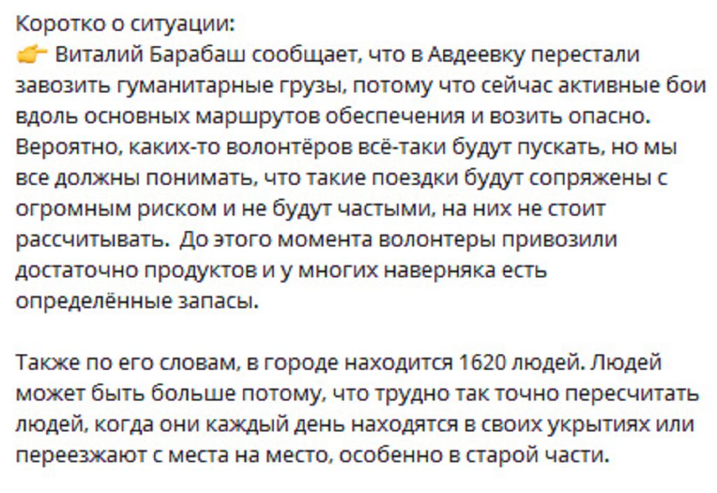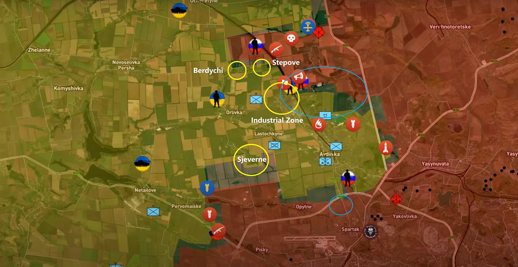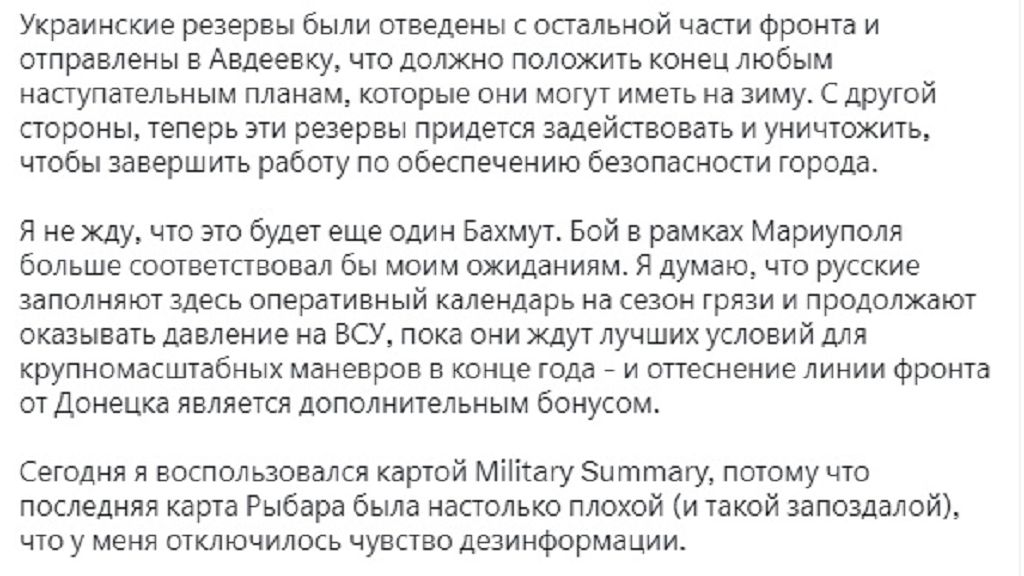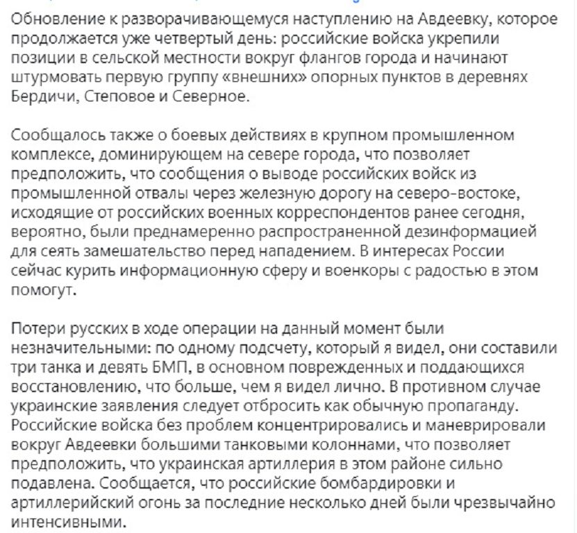 Интересно, что россвоенкоры по поводу Авдеевки дружно помалкивают, украинские источники вполне ожидаемо рассказывают о героической обороне, но тоже без конкретики. А вот иностранные агрегаторы скорее подтверждают первоначальные сообщения о выходе к Бердычам и Северному.