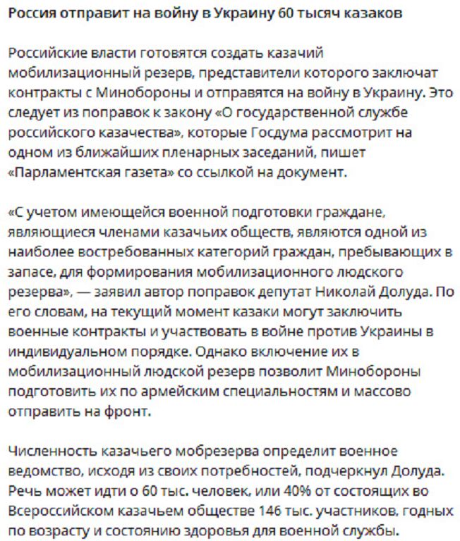 Москва пока пытается решить вопрос очередным прожектерством. Не получилось с мигрантами и силовиками, давайте казаков попробуем на войну загнать. Понятно, что из этого ничего не выйдет. Современные казаки уже были на этой войне, но реально воевали только подразделения из местных. Понаехавшие предпочитали сомнительные промыслы, типа крышеваний и отжимов, а по мере роста интенсивности боевых действий как-то незаметно самоэвакуировались. И с чего бы им воевать в этот раз — совершенно непонятно.