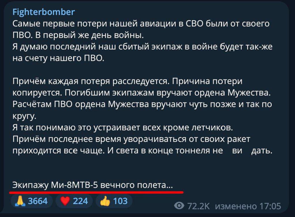 Ранее я как-то упоминал в Хронике… о странной стрельбе зенитчиков Днр во время пролета авиации Рф. Конкретно по тому случаю новой информации не появилось, но один из авиаТГК высказался на эту тему. Случайно или нет, судите сами…