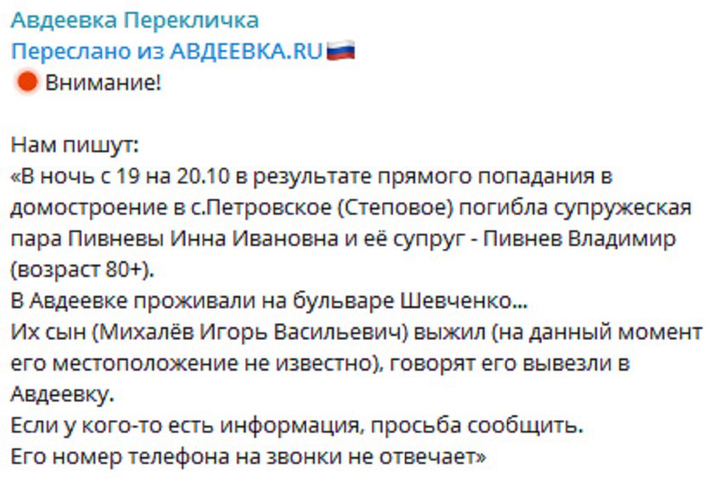 Примечательно в этом посте то, что раненого гражданского вывезли в Авдеевку, хотя авдеевская больница в плачевном состоянии и ранее больных вывозили в Селидово и Красноармейск.