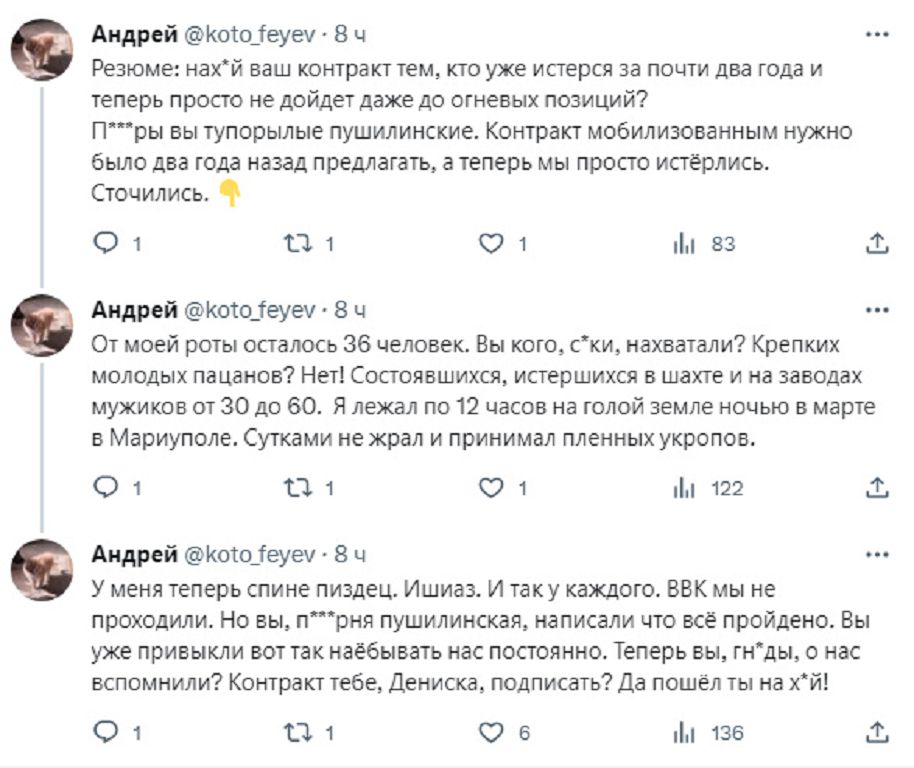 Проще говоря, обе армии буквально тают и нехватка людского ресурса со временем станет одним из определяющих факторов ведения боевых действий. Потому как эта «контрактизация» и так воюющих лишь способ «замылить глаза» Кремлю, требующему выполнения планов по привлечению на контрактную службу.