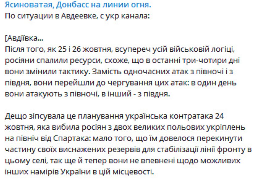После того, как 25 и 26 октября, вопреки всей военной логике, россияне сожгли ресурсы, похоже, что в последние три-четыре дня они сменили тактику. Вместо одновременных атак с севера и с юга, они перешли к чередованию этих атак: в один день они атакуют с севера, в другой – с юга.Несколько испортила это планирование украинская контратака 24 октября, которая выбила россиян из двух больших полевых укреплений к северу от Спартака: мало того, что им пришлось перебросить часть своих истощенных резервов для стабилизации линии фронта в этой деревне, так еще и теперь они не уверены в возможных других намерений Украины в этой местности.