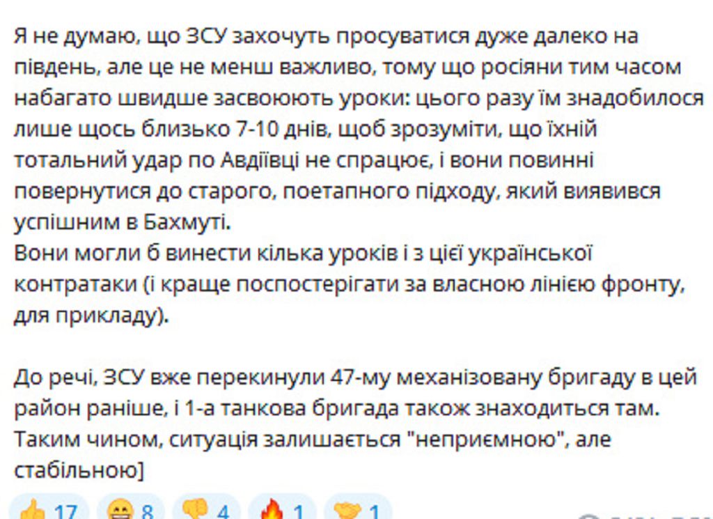 Я не думаю, что ВСУ захотят продвигаться очень далеко на юг, но это не менее важно, потому что россияне тем временем гораздо быстрее усваивают уроки: на этот раз им понадобилось всего около 7-10 дней, чтобы понять, что их тотальный удар по Авдеевке не сработает, и они должны вернуться к старому, поэтапному подходу, который оказался успешным в Бахмуте.