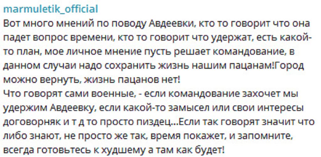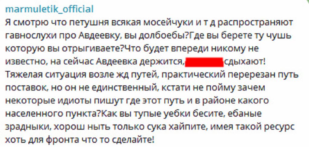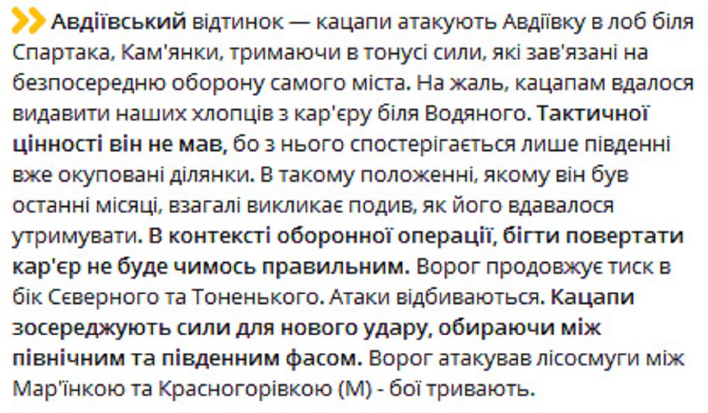▶️ Авдеевский отрезок — к..ы атакуют Авдеевку в лоб возле Спартака, Каменки, держа в тонусе силы, связанные с непосредственной обороной самого города. К сожалению, к…ам удалось выдавить наших ребят из карьера возле Водяного. Тактической ценности у него не было, потому что с него наблюдается только южные уже оккупированные участки. В таком положении, каком он был последние месяцы, вообще вызывает удивление, как его удавалось удерживать. В контексте оборонной операции, бежать возвращать карьер не будет правильным. Враг продолжает давление в сторону Северного и Тоненького. Атаки отражаются. К…ы сосредотачивают силы для нового удара, выбирая между северным и южным фасом. Враг атаковал лесополосы между Марьинкой и Красногоровкой (М) – бои продолжаются.