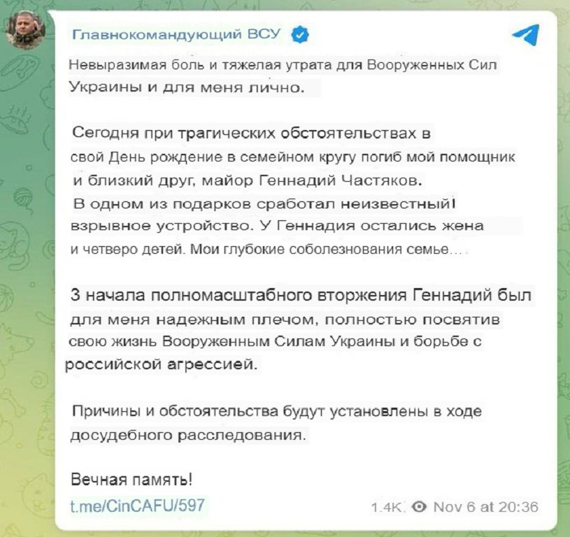 Днем 6 ноября 2023 г, вернувшись пораньше с работы домой, в честь своего дня рождения, помощник главкома ВСУ Залужного майор Частяков начал разбирать подарки. При распаковке одного из них прогремел взрыв. Майор погиб, его сын, находившийся неподалеку, получил тяжелые травмы.