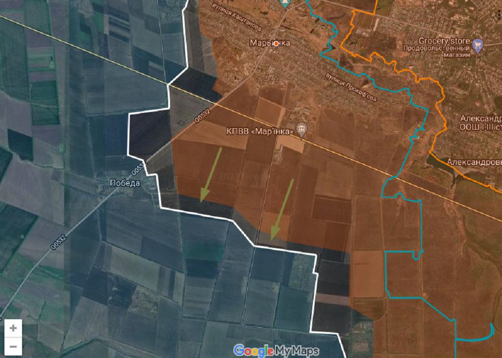 Продвижение южнее Марьинки, о котором пишет укристочник, это обход маленького поселка Победа с востока. Ранее Днр/Рф подошли к нему с северо-востока, по трассе от Марьинки на Угледар.