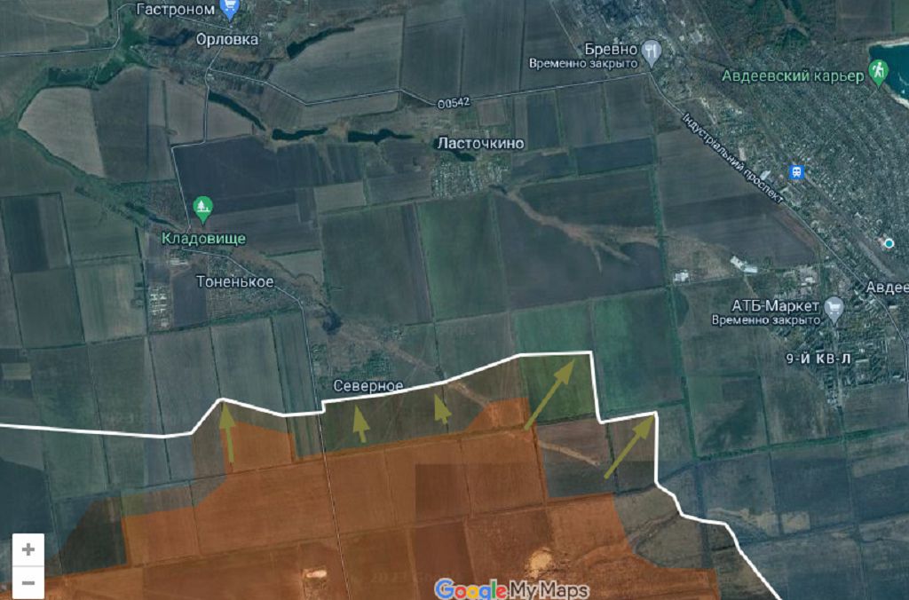 На южном участке продвижение заметнее. Там Днр/Рф приблизились к Авдеевке с юго-запада и выходят к окраинам Северного.