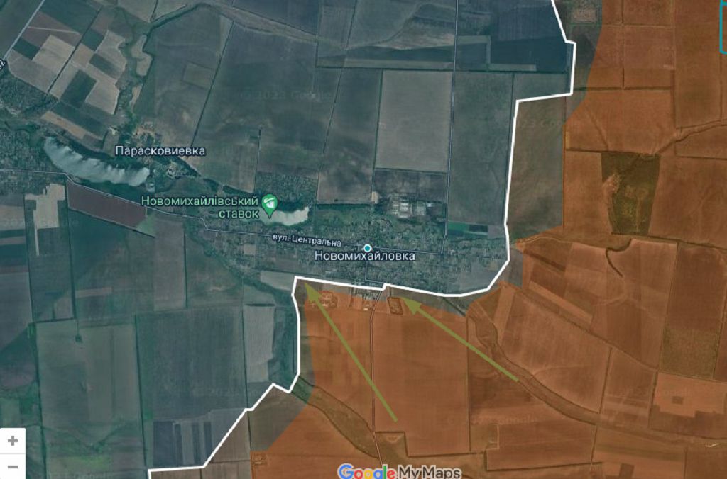 Но основные события сейчас разворачиваются южнее Марьинки, там части Днр/Рф обошли Новомихайловку с юга и зашли на её южную окраину.