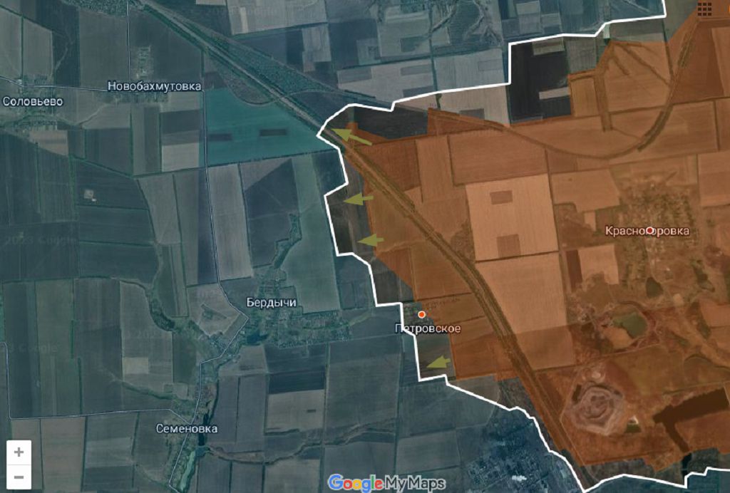 Там и гремело в последние дни. На этом участке продолжается давление с юга на Новокалиново, части Днр/Рф продвинулись по междупутью ЖД линий к станции Очеретино, заметно выдвинулись на запад севернее Петровского, попутно взяв под свой контроль его руины, и немного продвинулись на запад чуть южнее этого хутора.