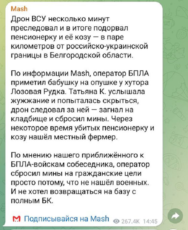 Недавнее сообщение новостных телеграмм-каналов о бомбежке с дрона пенсионерки с козой шокировало многих, но такова печальная реальность, гражданские постепенно становятся запасной целью для операторов боевых беспилотников.