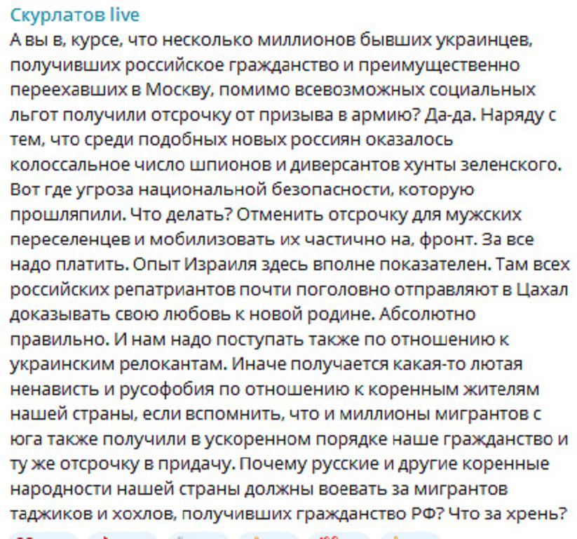 - «Новые граждане». Их тоже не жалко, но воевать за Россию они совершенно не спешат. Облавы на выходцев из Средней Азии дали околонулевой эффект, диаспоры их дружно выкупают на всех этапах, и на фронте их практически не видно. Кроме того, облавы, наряду с падающим курсом рубля, сильно пошатнули привлекательность России для переезда, а это убытки «уважаемым людям» из властных кругов.
