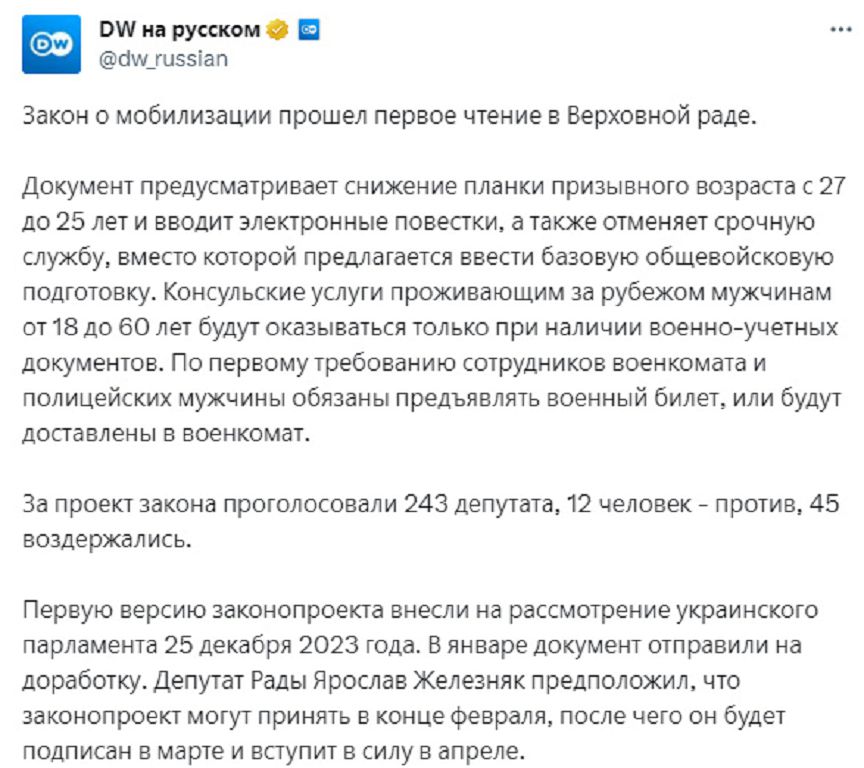 Сегодня укр парламент принял закон о могилизации в первом чтении. Многие его нормы позаимствованы у российских партнеров, добавлены свои свирепствования, но, в любом случае, процесс пошел. Надо отметить, облавы на «желающих» защищать укрвласть и так перманентно идут, просто они теперь будут «обзаконены». Точь в точь по образцу РФ, когда власть оперативно пишет «законы» под свои сиюминутные нужды.