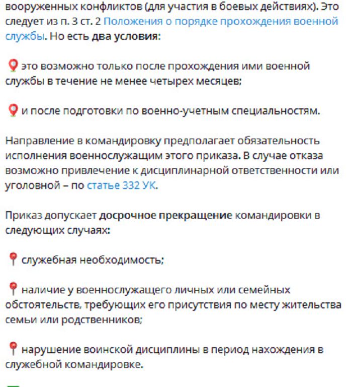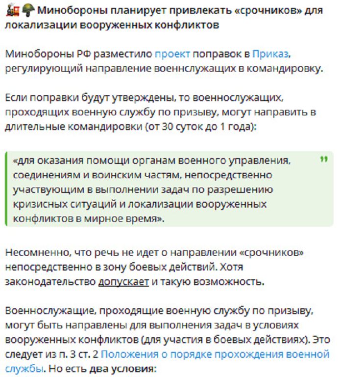 По всей видимости, МО РФ отдает себе отчет о перспективах мобилизации «новых граждан» и заранее готовит резерв из срочников. Отправку на фронт закамуфлируют под «командировку».