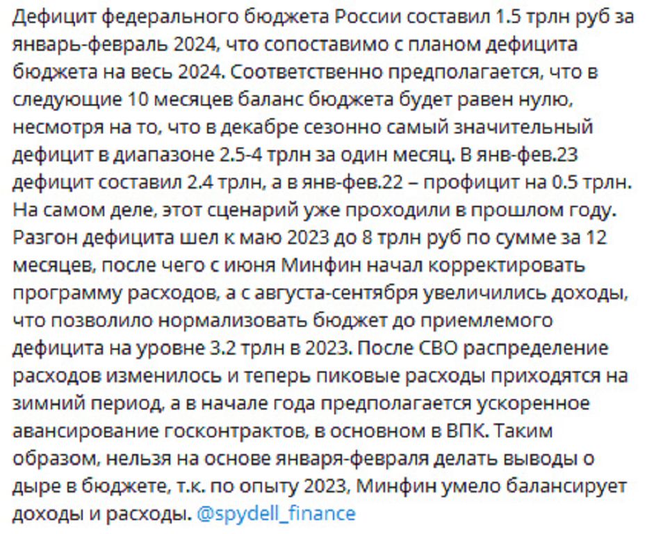 На фоне сообщений о рекордном дефиците российского бюджета (за первые месяцы выбран годовой лимит) появились и альтернативная, более оптимистическая аналитика. Аргументы, вкратце, сводятся к тому, что в начале 2023 была похожая ситуация, но правительство РФ после трат в начале года сбалансировало бюджет, сведя дефицит по итогам года к приемлемым цифрам.