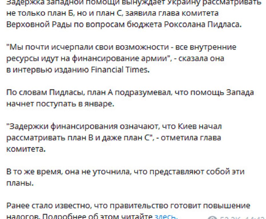 В чем суть: сейчас Украина лихорадочно ищет средства для наполнения бюджета. Представители власти упоминают разработку плана B и плана C для случаев, если иностранное финансирование так и не будет предоставлено.