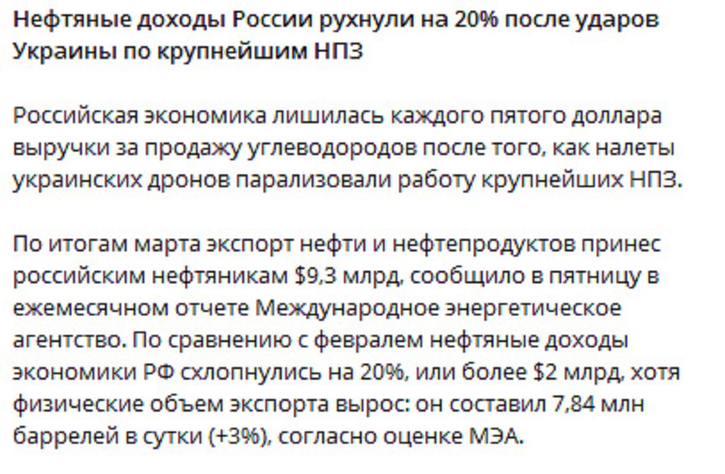 Как известно, удары «украинских», а точнее британско-французских дронов по НПЗ России нанесли существенный ущерб. По сведениям МТ, ссылающегося на «Международное энергетическое агенство», в марте нефтяные доходы России упали на 20% относительно предыдущего месяца, февраля. Притом, что экспорт сырой нефти увеличился, но цены на неё заметно ниже уже переработанных нефтепродуктов, поэтому замещения доходов не происходит.