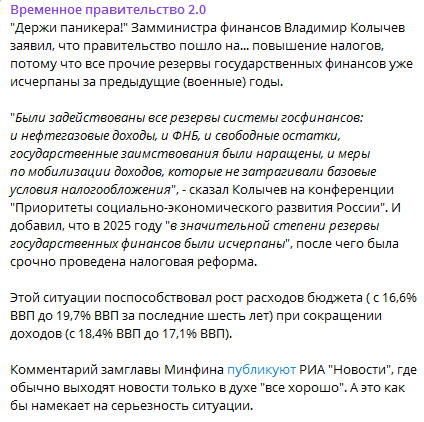 Цитата: Администратор от 21.11.2025, 00:36Иначе говоря, в перспективе денег у власти не добавится. А отсюда следуют попытки ободрать народ посильнее...