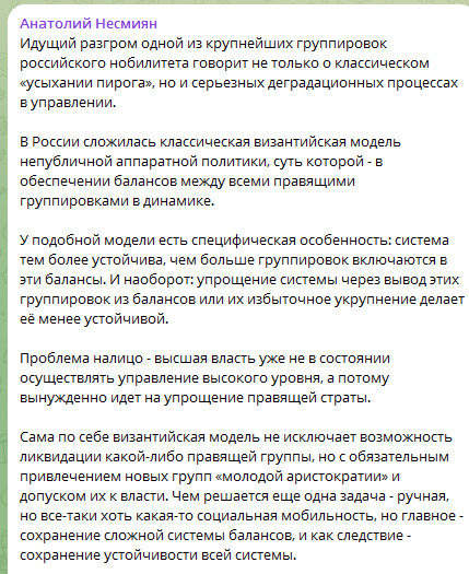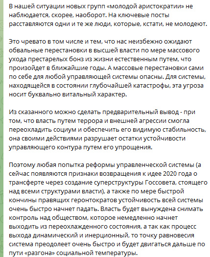 Сегодняшние события, о которых пишет Несмиян, это частность. Проще понимаемая лишь в силу ограниченности срока человеческой жизни. Но паразитаризм обречен, и любое новое государство, а их будет много на обломках Рф и Ук, столкнется с той же проблемой: холопов для содержания знати мало, да и те всячески уклоняются от поборов. А следовательно, кормушка и у них будет оскудевать, приводя к взаимной грызне, междуусобным войнам и развалам этих госв.