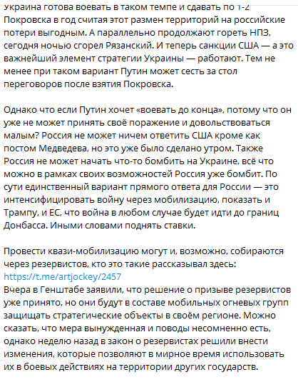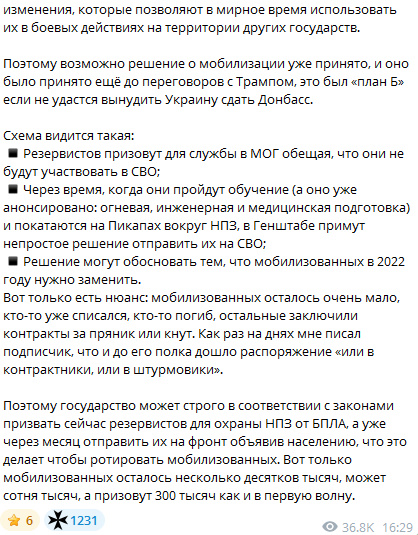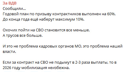 Цитата: Администратор от 29.10.2025, 05:23Очевидно, могилизация в Рф в той или иной форме неизбежна. Регионы срезают выплаты уже массово. Бесплатно люди не пойдут, а война рабов требует. Значит, попытаются принудительно. Может, начнут с т н "мобрезерва", может еще одну "частичную", но как то затеют...