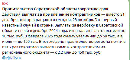 Цитата: Администратор от 15.10.2025, 17:52Власти регионов продолжают (https://t.me/mobilizationnews/23996) резко снижать выплаты за контракт