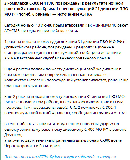 Украинские ВВС планируют получить 85 F-16 и уже имеют ракеты с радиолокационным самонаведением и высокоточные планирующие бомбы, которые F-16 могут использовать в бою. Не удивляйтесь, если эти самолеты начнут наносить удары по российским базам в Крыму в ближайшие недели. Это базы, чья противовоздушная оборона постоянно подавлялась последовательными залпами ракет ATACMS» (Forbes) (https://www.forbes.com/sites/davidaxe/2024/06/12/ukrainian-atacms-rockets-are-blowing-up-russias-best-s-400-air-defenses-as-fast-as-the-s-400s-can-deploy-to-crimea/?ss=aerospace-defense)