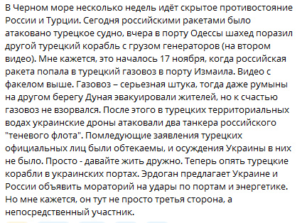 Мне пока непонятно, зачем Россия еще и с Турцией пытается нагнетать? За торговлю с Ук? А если Анкара пойдет на обострение? Разок самолет уже сбивали и Кремль сразу сел на жопу. А теперь чем ответят? Еще и с Турцией повоевать захотелось?