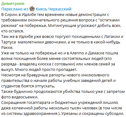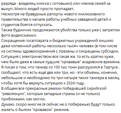 Цитата: Администратор от 09.04.2025, 23:29Жалеть может и будут, не без этого. О распаде совка многие до сих пор жалеют. Но такова неумолимая история: неэффективные паразитарные режимы обречены, хоть в Сирии, хоть в Ливии, хоть на огрызках СССР...