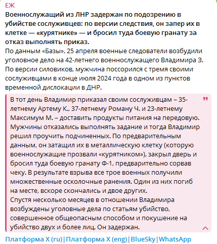 Цитата: Администратор от 02.05.2025, 23:38Скажем прямо, то, что такой случай дошел до скандала, это исключение. Практикуется подобное сплошь и рядом, хотя и не афишируется. Просто других методов заслать людей на заведомый убой придумано не очень много.
