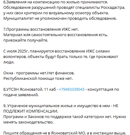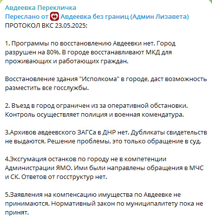 Цитата: Администратор от 25.05.2025, 15:00Абзац в Авдеевке продолжается. Режим концлагеря остается, восстановление ограничено, компенсаций по имуществу нет, по жилью - что контора напишет, то и дадут. Но! стройматериалы для своих домов вроде бы дают, а тащить их придется на горбу, потому как режим концлагеря и машину с водителем без авдеевской прописки просто не пустят в город.